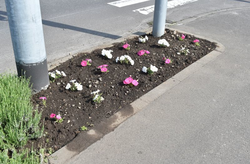 会社に接した植樹桝に、色鮮やかなペチュニアの花を植栽しました。
